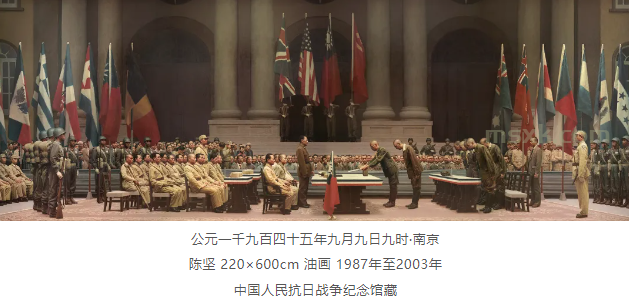这幅作品以纪念碑式的构图和雕塑化的人物造型,塑造了五位壮士宁死不屈的英雄形象,成为凝聚民族精神的视觉象征 运用戏剧性的光影对比和动态构图,再现了特殊战争环境的紧张氛围,展现了人民战争的智慧与力量。 以宏大的战争场面和精湛的写实技巧,再现了台儿庄战役的惨烈与悲壮。《公元一千九百四十五年九月九日九时·南京》(陈坚,1987-2003年) 历时16年创作,以气势恢宏的整体构架再现了日军投降签字仪式的历史场景,兼具思想性、艺术性和观赏性。
