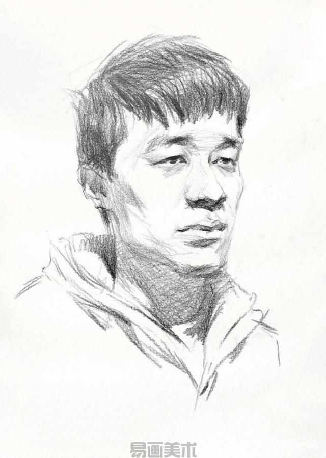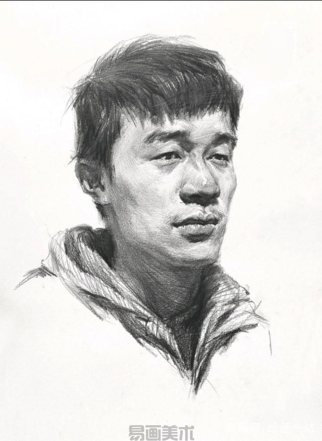 学习美术的人物头像常见的考题为典型的四分之三侧面男青年,在刻画的时候,一定要多考虑对象的形象,抓住对象的特征、动态、服装特点以及男性刚毅、硬朗的气质,并在作画之前想好所要采用的处理方法。我们来简单分析一下对象,其脸型为方形脸,棱角分明,眉毛较粗,单眼皮,高鼻梁,宽嘴巴。服装为冬季的棉服,刻画时注意质感表现。
