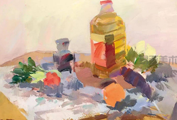 一幅画成功与否,关键要看能否形色结合。可所以,平时训练时要考虑到这方面的提高,功底和手头功夫也是看最后画面的深入和画面氛围的营造是否出神入化。所以,在这组静物中,不锈钢油壶的处理不可太花,要在整体颜色中控制其反光和环境色的融合。水果和果盘同样是画面中重要的部分,要刻画得精彩,层次和颜色丰富。注意和周围环境的关系,要衔接恰当,使画面更加统一、协调。