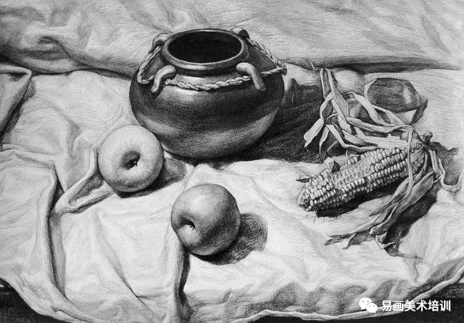 教师在辅导学生作画时,经常会看到有的学生把画面的每一个物体、每一个细小的布纹都刻画的非常仔细,生怕落掉任何一个细节,画面里面面俱到,或者把衬布刻画的比主体物更细腻,再或者把次要物体的刻画超过了主体物,从画面里跳出来,这些都正是静物素描里容易进入的一个误区,这样的结果是造成了整个画面没有主次关系,而主次不分明,画面就不会达到统一。