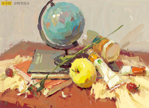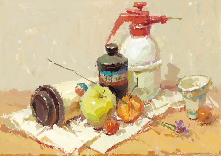 水粉颜料要画得色块明确、轮廓清楚比较容易,但要画得衔接自然、柔和就比较难。在写实风格的绘画写生中,表现对象的虚实关系,往往成为一个难题。在写生习作中,物体轮廓线画得像剪贴一样清楚的弊病是常见的。这弊病会使物体与周围环境脱离,削弱了对象的立体感和空间感。产生这种状况的原因有两个方面:一是观察方法,从局部出发,没有去比较物体轮廓线的虚实关系而形成的,属认识问题;二是虽在观察中认识这种虚实的关系,而缺乏表现这种关系的方法。前者的解决办法在第三章第五节“色彩的观察与调配”中已有讲述,后者的化解则需要了解水粉色衔接的一些基本规律。