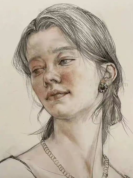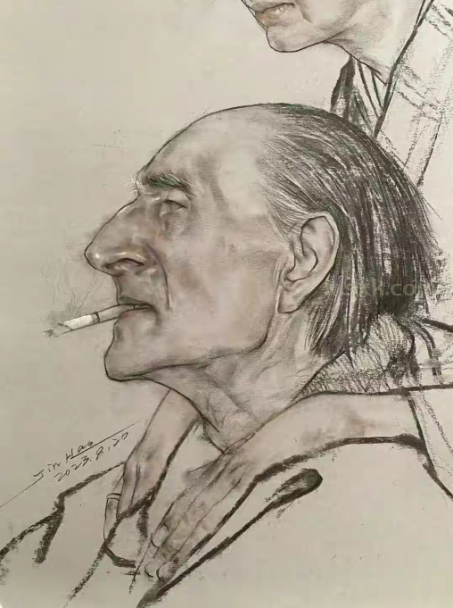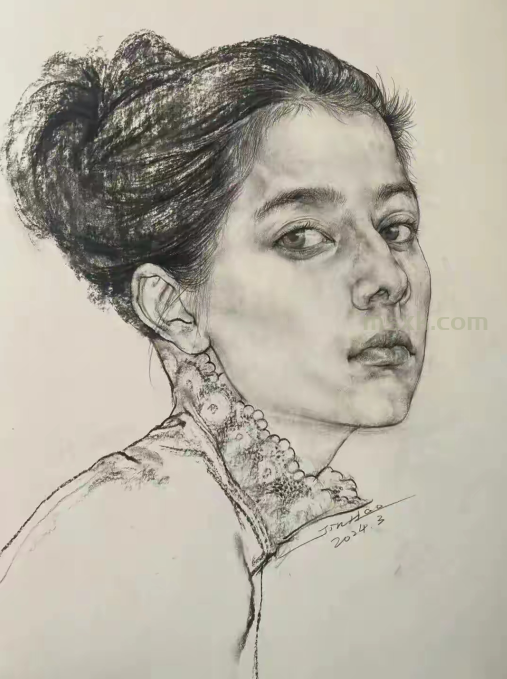 这是画家金浩的素描头像作品,越看越好看,虽然也是有抹擦明暗调子,但掩盖不住功力深厚。作品有费钦的风格,这可能反映出他对费钦艺术成就的欣赏与学习,同时也是个人艺术探索和成长的一部分。
