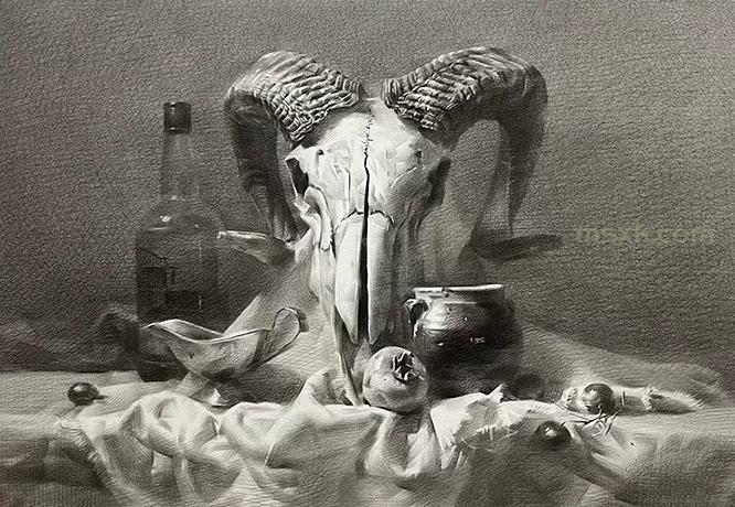 具体表现为近端清晰,远端模糊;近端层次丰富,远端层次简单;近端对比强,远端对比弱。运用这个规律,可通过调整色调层次的多少、对比的强弱、形象的具体与模糊等采取得良好的空间效果,虽然我们在画头像的时候并没有觉得在人物的面部前后有多大虚实变化,但我们必须明白,不同距离、不同形体前后重叠造成不同的虚实,这种变化是互相对照而存在的。只有加强某些主要形体,深入表现距画者近端的物体层次,减弱次要部分,增强虚实对比,我们才能在平面的纸上制造出物体的空间感。