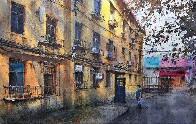 如透过细枝的天空,道路上的起伏与车痕,房屋建筑中的门窗,细画这些重要局部能使画面色彩生动,也能表现生活气息。