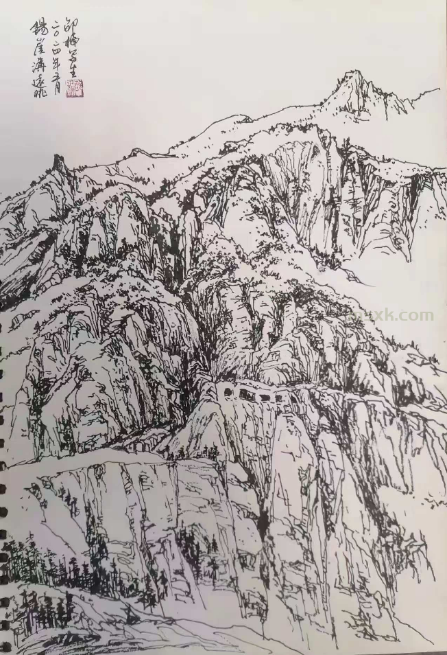 钢笔画是一种独特且又方便的绘画形式,在外出差,有空画一点也很方便,钢笔画主要以线条,以其线条的精细和层次感著称。绘制山峰时,钢笔画能够表现出山体的质感和光影效果,给人以强烈的视觉冲击力。