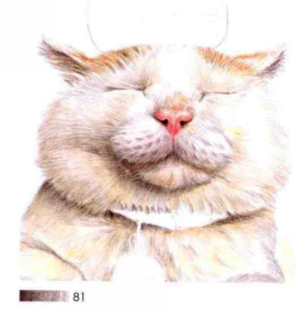 5.猫咪的脸部绝对是刻画的重点,所以需要表现出一些细节,这里用尖细的黑色铅笔再次强调脸部皮毛的同时,画出一些小小的胡茬质感,会显得更加可爱,同时将眯着的眼睛线条强调一下。