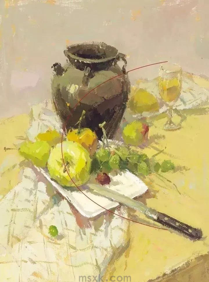 在色彩静物构图中,要注意画面的均衡和对称,不仅要注重单个物体的色彩和形态,还要考虑整个画面的平衡和对称,从而使画面更加和谐和美观。构图是画好色彩静物的第一步,奠定了整幅画的半壁江山,经过很多专业人士的反复研究和推敲。