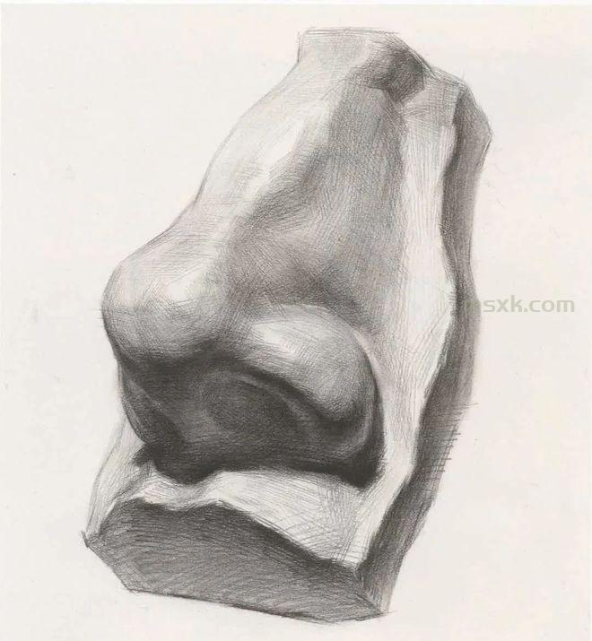 画鼻子时,从第一部定位置开始就要有体块的概念。虽然我们会从平面入手,但我们最终表现的是一个游离体、有变化的立体物象。要时刻把握鼻子形体变化的转折位置,在铺明暗的阶段要依据光线区分明暗部,目的是快速建立鼻子最基本的体块