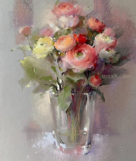 Duchêne的水彩和色粉花卉作品,展现了她对色彩和光影的独到理解。她运用柔和而丰富的色调,对色彩和光影有着独到理解,不同的光影效果和环境色赋予了鲜花不同的风采,使画面色彩鲜艳明亮、变化丰富,同时又保持着高雅、温馨和浪漫的氛围,让每一朵花都仿佛充满了生命力,每一朵花都是她心灵深处情感的映射,仿佛在向观者传递着生命的脆弱与坚韧。无论是盛开的玫瑰,还是含苞待放的百合,她都能以极具诗意的方式捕捉到它们的灵魂。她的画作中,花瓣的每一条纹理、每一个色彩的渐变,都充满了生命的气息,让人仿佛能感受到花朵的芬芳与柔和。