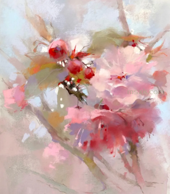 在笔触表现上,画背景笔触大胆奔放,和描绘花卉时细腻的刻画形成鲜明的对比,笔触感很强。她喜欢使用软性色粉笔,大面积涂抹再小面积一点点叠加、塑造,一笔到位、多种颜色混合一起,既能表现出花瓣和树叶的纹理、肌理,又能呈现出虚实效果,使作品更具质感和层次感。