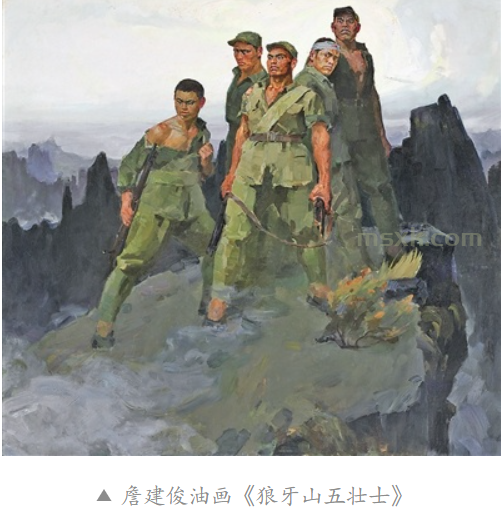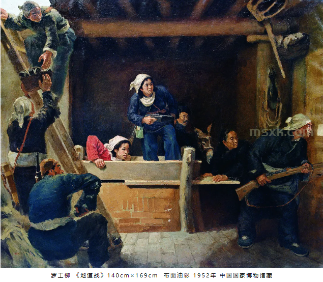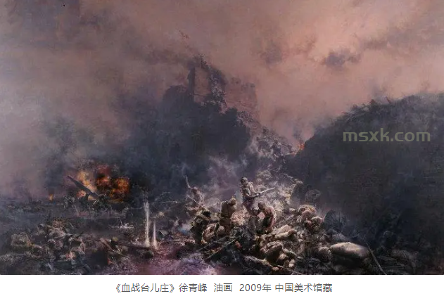 这幅作品以纪念碑式的构图和雕塑化的人物造型,塑造了五位壮士宁死不屈的英雄形象,成为凝聚民族精神的视觉象征 运用戏剧性的光影对比和动态构图,再现了特殊战争环境的紧张氛围,展现了人民战争的智慧与力量。 以宏大的战争场面和精湛的写实技巧,再现了台儿庄战役的惨烈与悲壮。《公元一千九百四十五年九月九日九时·南京》(陈坚,1987-2003年) 历时16年创作,以气势恢宏的整体构架再现了日军投降签字仪式的历史场景,兼具思想性、艺术性和观赏性。