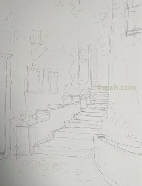 用铅笔轻轻勾勒出画面的大结构:石阶的走向、建筑的轮廓、植物的分布,重点标记光影的分界区域(如受光的石阶面、树叶的亮部),线条要简洁,避免过重影响后续上色。