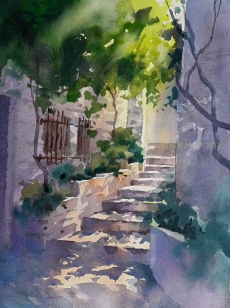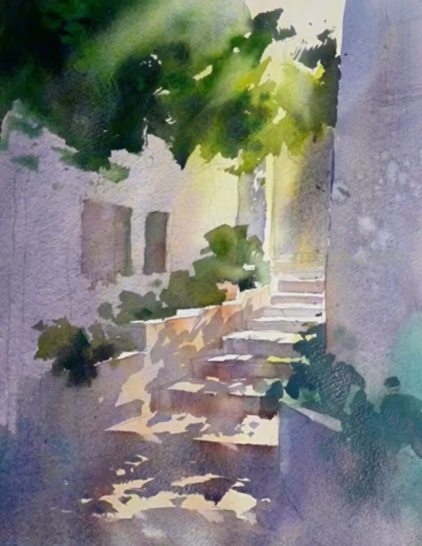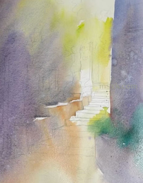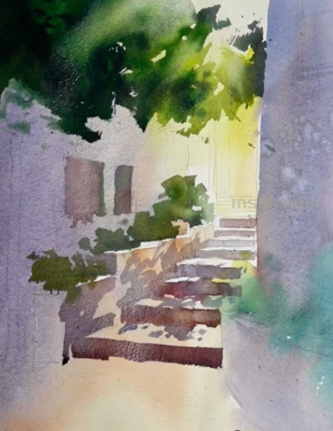 留出受光面的空白(或用淡米色轻铺),强化 “光影对比”,突出阳光洒在石阶上的质感。