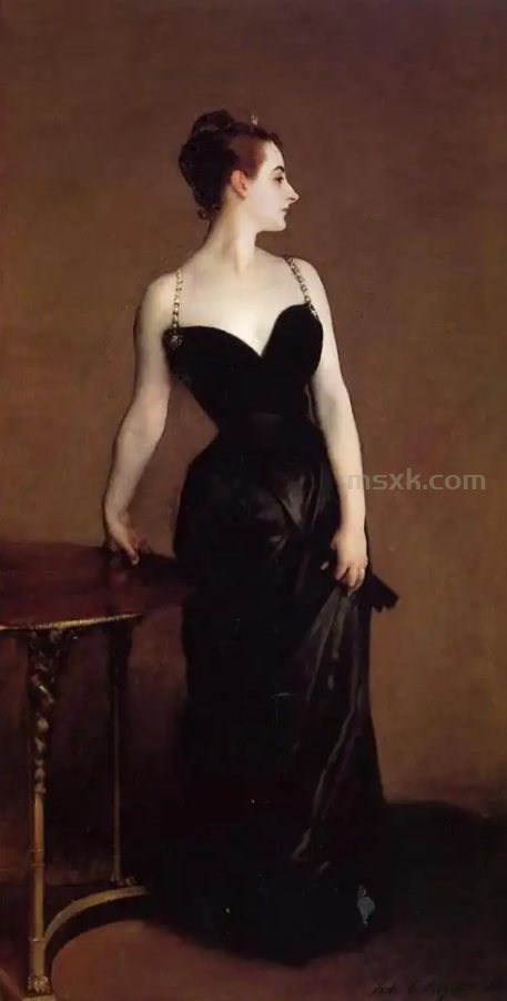 经典作品是萨金特艺术理念的最佳载体。26岁创作的《X夫人肖像》堪称其争议与成就并存的巅峰之作,他以深色背景衬托人物的黑色长裙与淡紫色皮肤,线条简洁有力,精准刻画出处上流社会名媛的冷艳气质。这幅作品因大胆的构图引发当时的道德争议,却开创了全身肖像的新范式,其黑色礼服设计甚至启发了可可·香奈儿的小黑裙时尚革命。移居英国后创作的《康乃馨、百合、玫瑰》,则以柔和的光影与印象派的光色表达,标志着他从争议艺术家向主流认可大师的转型,奠定了其在英国艺术界的地位。而《爱德华·达利·博伊特的女儿们》将肖像与室内场景融合,独特的构图与光影处理尽显现代感,成为其代表作之一。