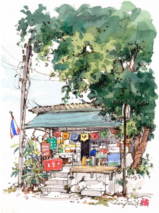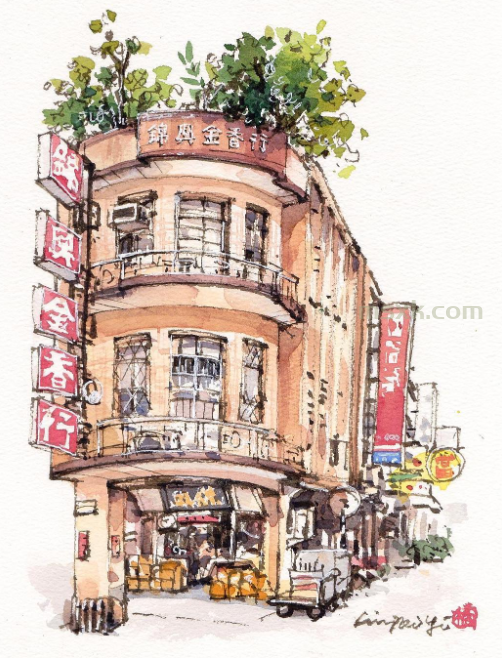 2013年,毕业于国立台湾师范大学图文传播系的橘枳,正式将画画纳入每日生活,从此开启了长达12年的手绘之旅。不同于专业画家的严谨创作,她选择以软毛笔勾勒轮廓,搭配水彩晕染色彩,线条虽不刻意精细,却自带松弛感,色彩清新淡雅,藏着生活最本真的模样。她从不凭空臆想素材,而是带着画板行走在台湾的街头巷尾,把老建筑的斑驳、小店的烟火、路人的闲适,一一捕捉进画纸中。