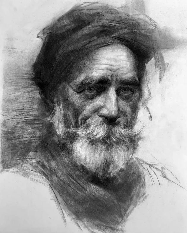 完成稿原始照片1、轮廓勾勒:首先确定头部位置和比例,用轻柔的线条勾勒出头部的大致轮廓,以及五官的基本位置和大致的明暗关系。2、五官明暗细化:细化五官轮廓与明暗,特别注意眼睛、鼻子和嘴巴的形状与位置,确保符合中老...